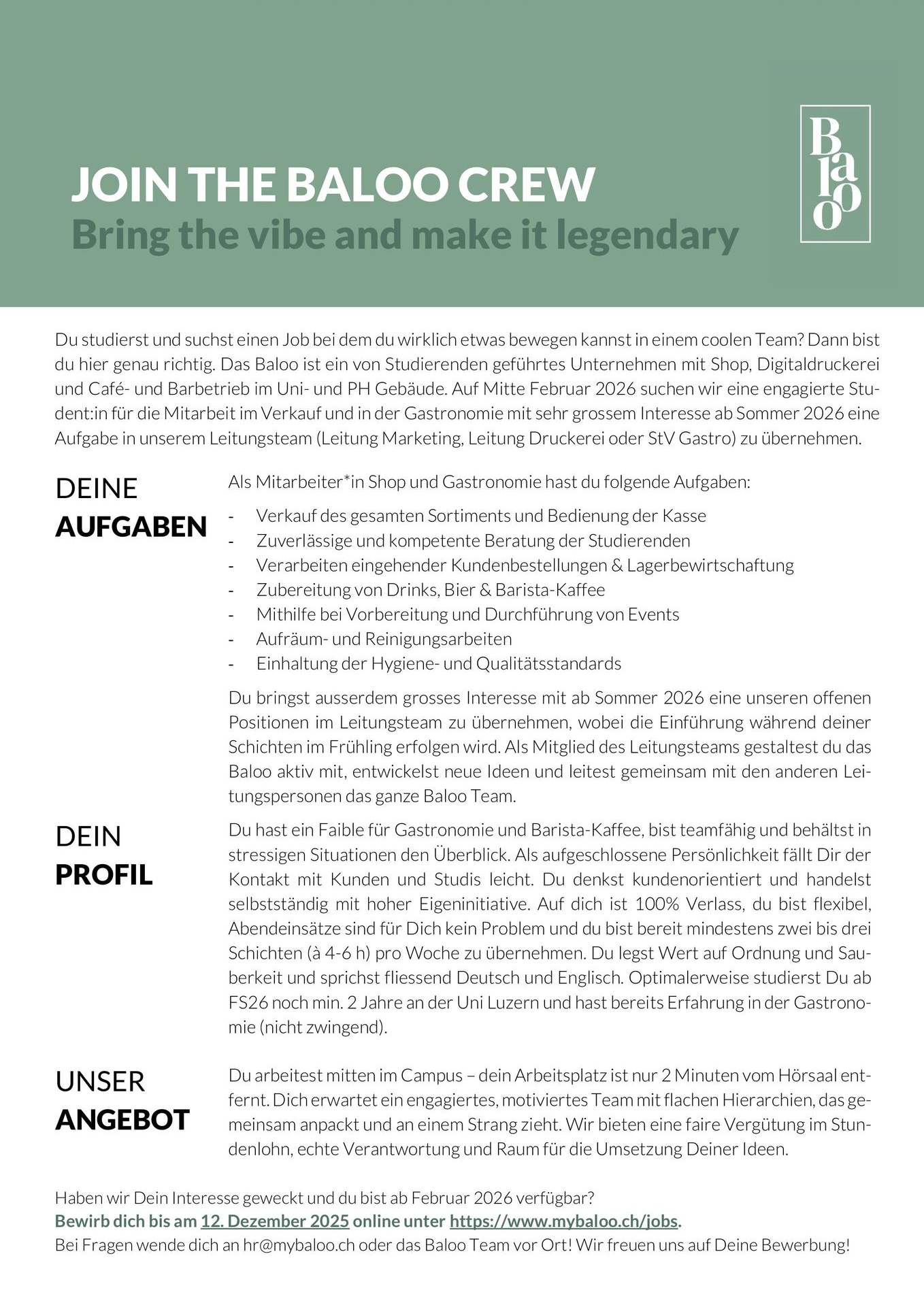 Das Baloo ist ein von Studierenden geführtes Unternehmen mit Shop, Digitaldruckerei und eigenem Café- und Barbetrieb im Uni- und PH Gebäude EG West. Ab dem Februar 2026 suchen wir neue motivierte Studierende für die Mitarbeit im Verkauf und in der Gastronomie.
